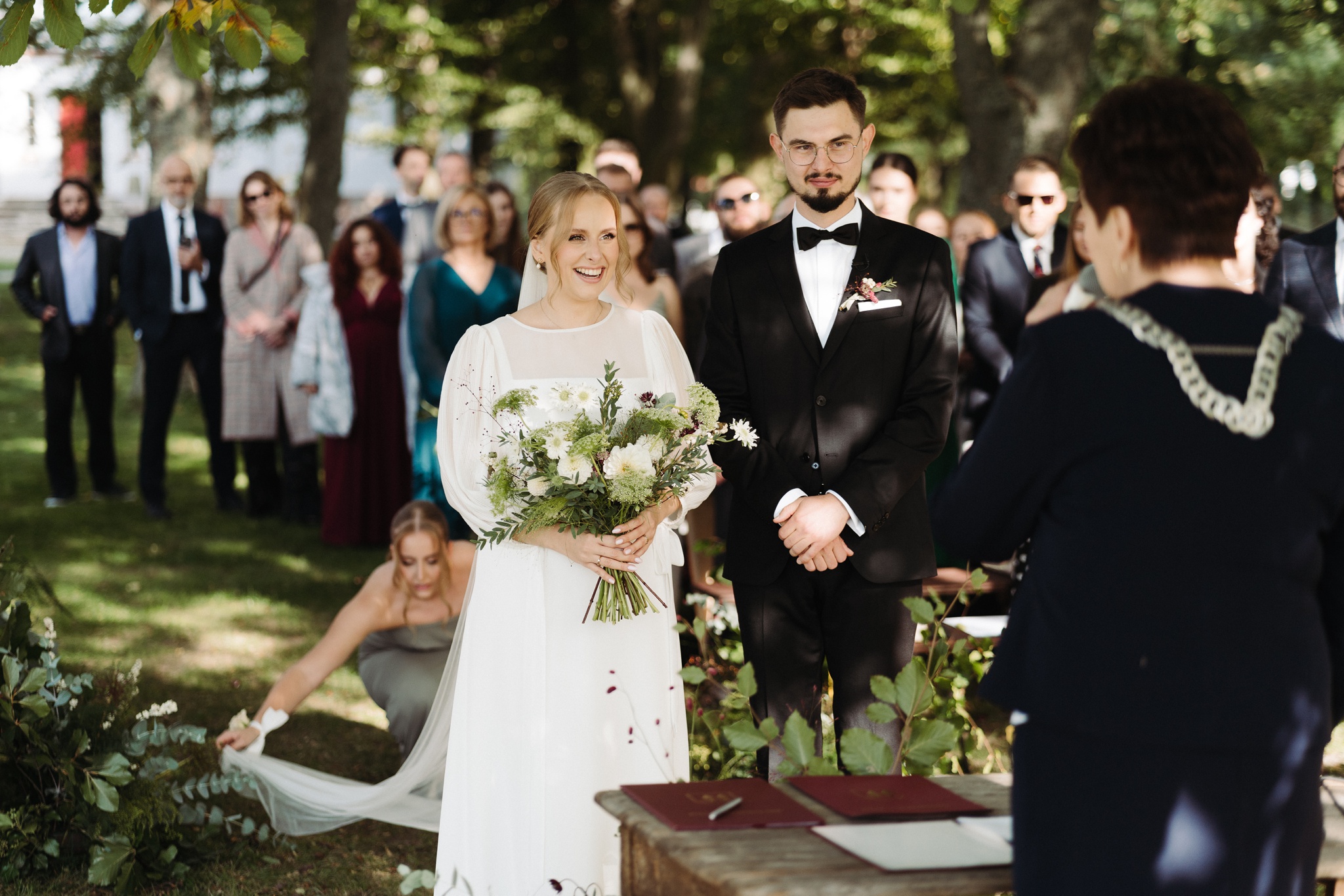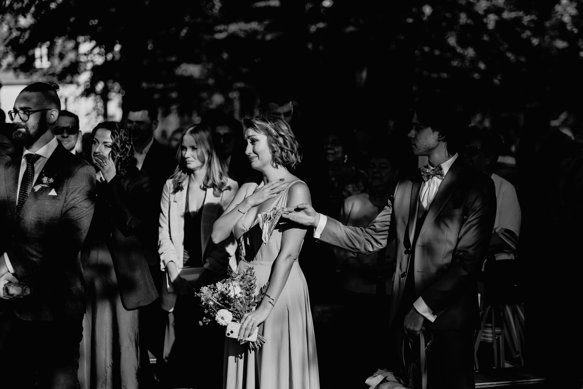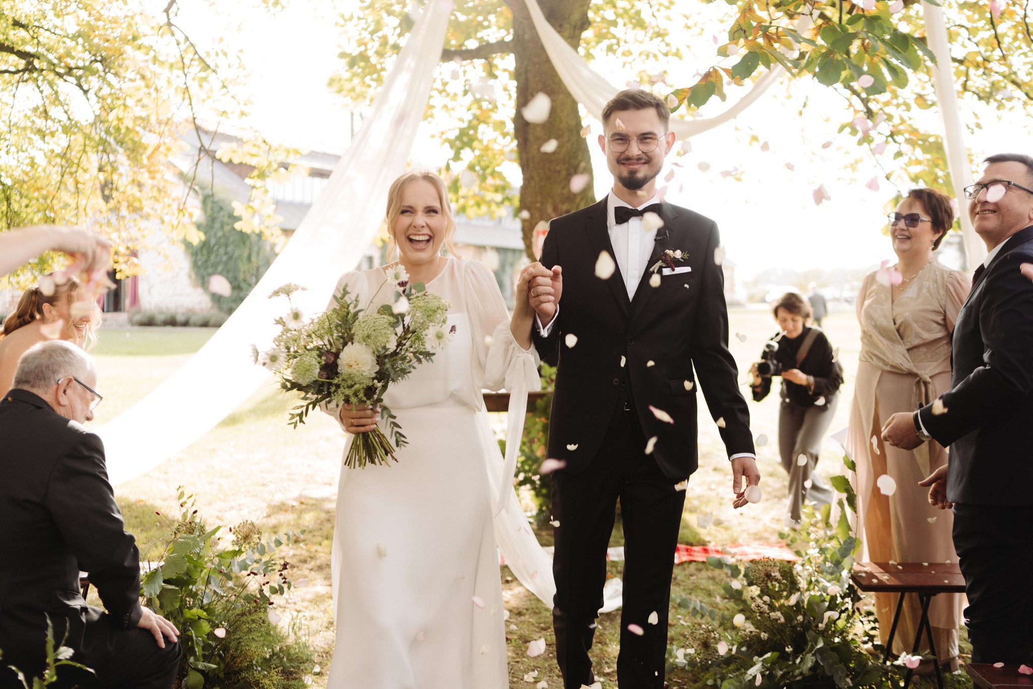 Ceremonia ślubu plenerowego w Ceglarnii Jarosławki była absolutnie wyjątkowa. Otoczenie natury, drzewa, światło i przede wszystkim własne przysięgi, które nadały tej chwili bardzo osobisty charakter. Było romantycznie, intymnie i niezwykle prawdziwie. Wzruszenie było wszechobecne – zarówno wśród gości, jak i… po mojej stronie obiektywu.